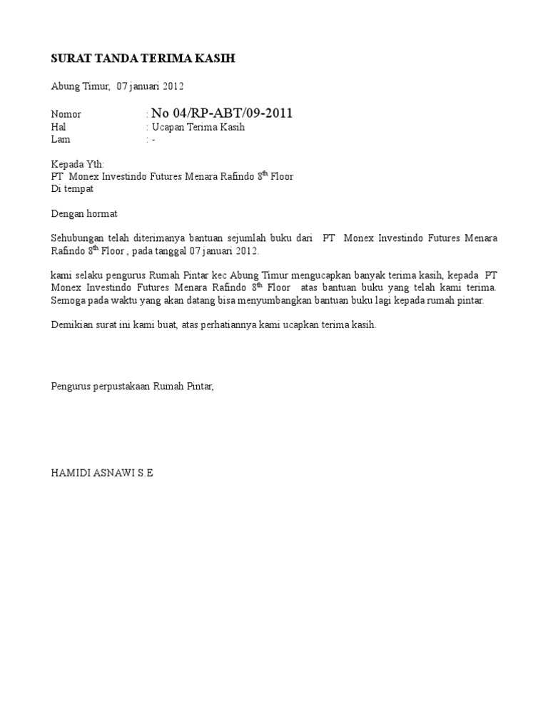 Contoh surat ucapan terima kasih atas sumbangan kewangan bagikan contoh. Sekali lagi kami ucapkan terima kasih dan semoga Allah SWT melipatgandakan belasan atas segala bentuk bantuan serta dukungan yang telah diberikan. 100000000- seratus juta rupiah.